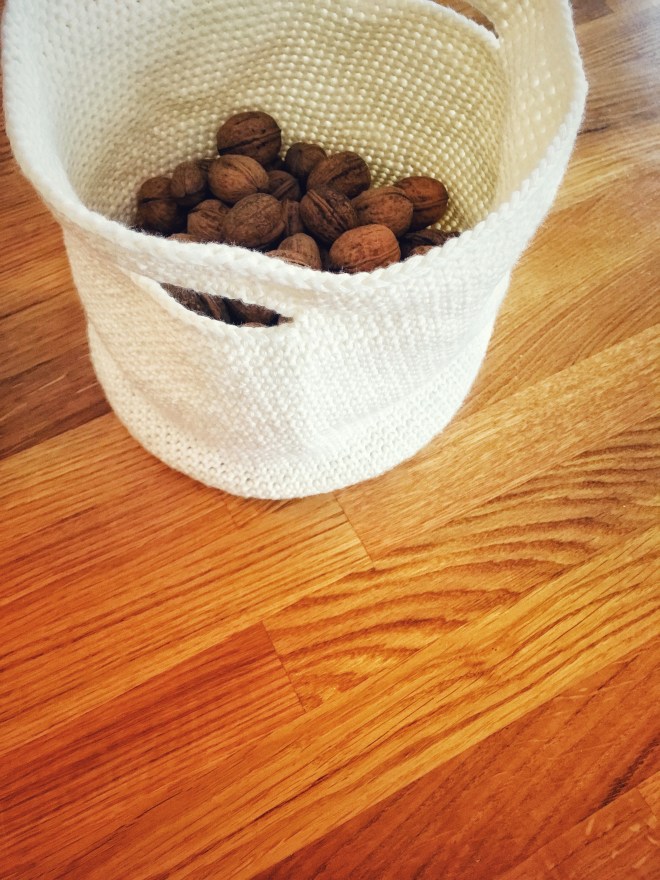 Eigenlijk bewaar ik er allerhande prullaria in, zoals washi tape, een luciferdoosje, een bakje voor online bankieren, een puntenslijper,… maar voor de foto koos ik toch maar voor okkernoten.