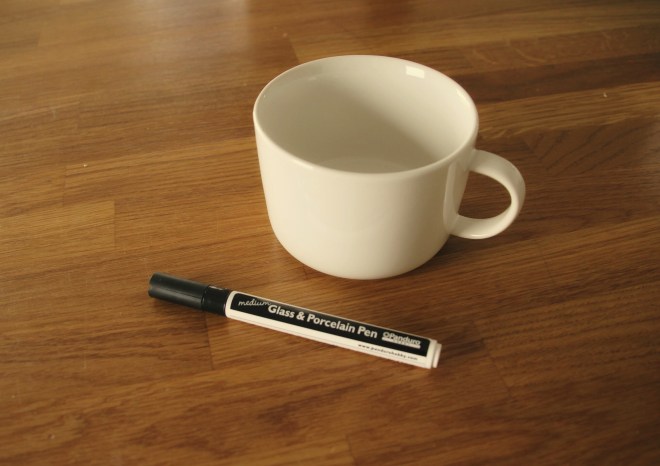 Een koffietas of theekop decoreren is super easy. Je koopt enkele witte kopjes (in mijn geval uit de Hema, maar je kan ze evengoed in de kringwinkel halen). Een porcelain marker of stift geschikt voor porselein en glas vind je in de hobbywinkel.