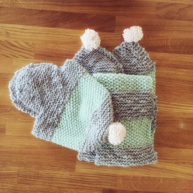 Ik paste de kleuren van het patroon wel wat aan. Zo breidde ik de sjaal en muts afwisselend in grijs en muntgroen. Voor de pompons gebruikte ik pastelroze.